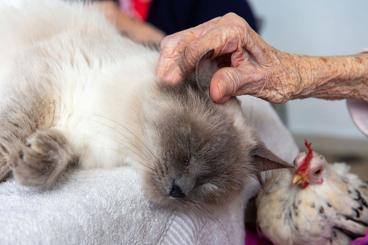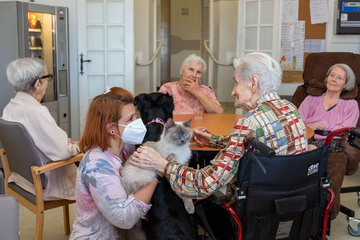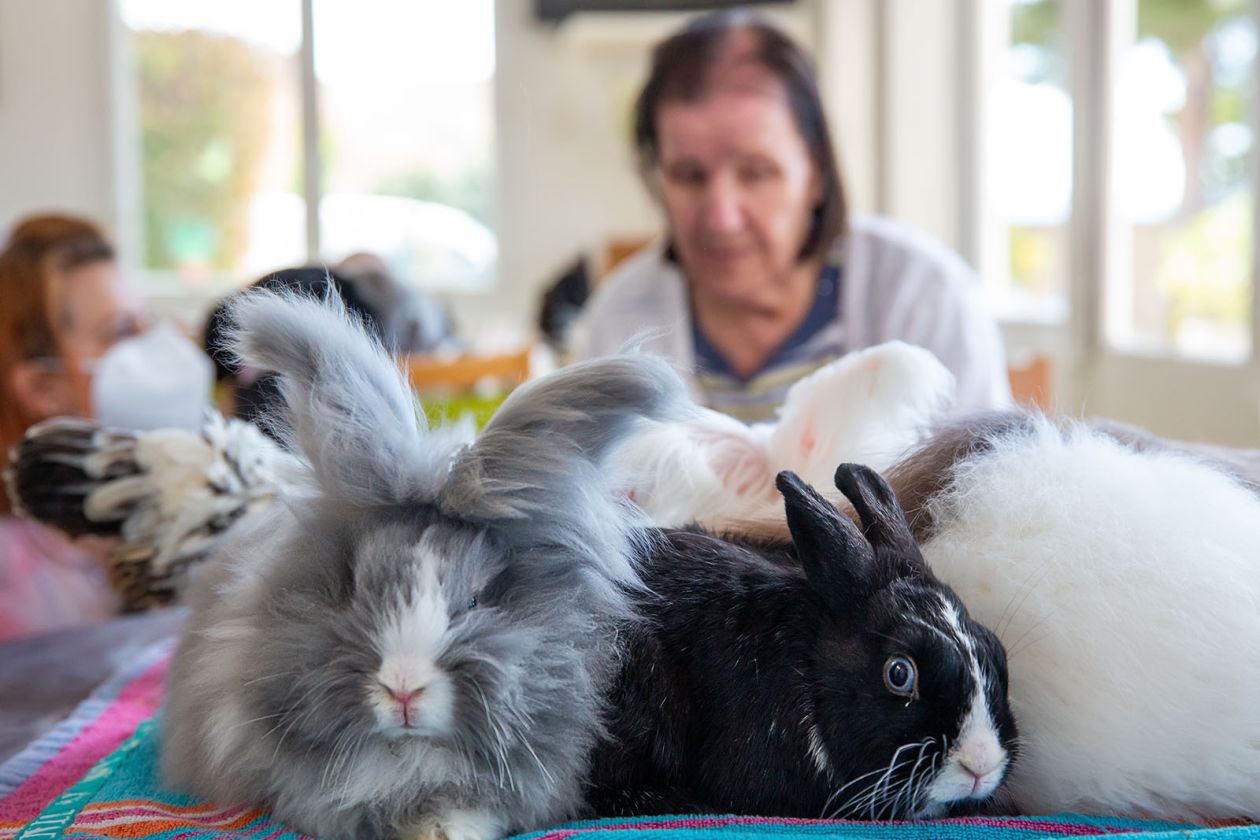 Tous les mardis matin, nous accueillons Magalie et son équipe animalière pour le plus grand plaisir de nos résidents. Chiens, chats, lapins, poules, coq, et autres, interagissent et offrent un moment de douceur à chacun